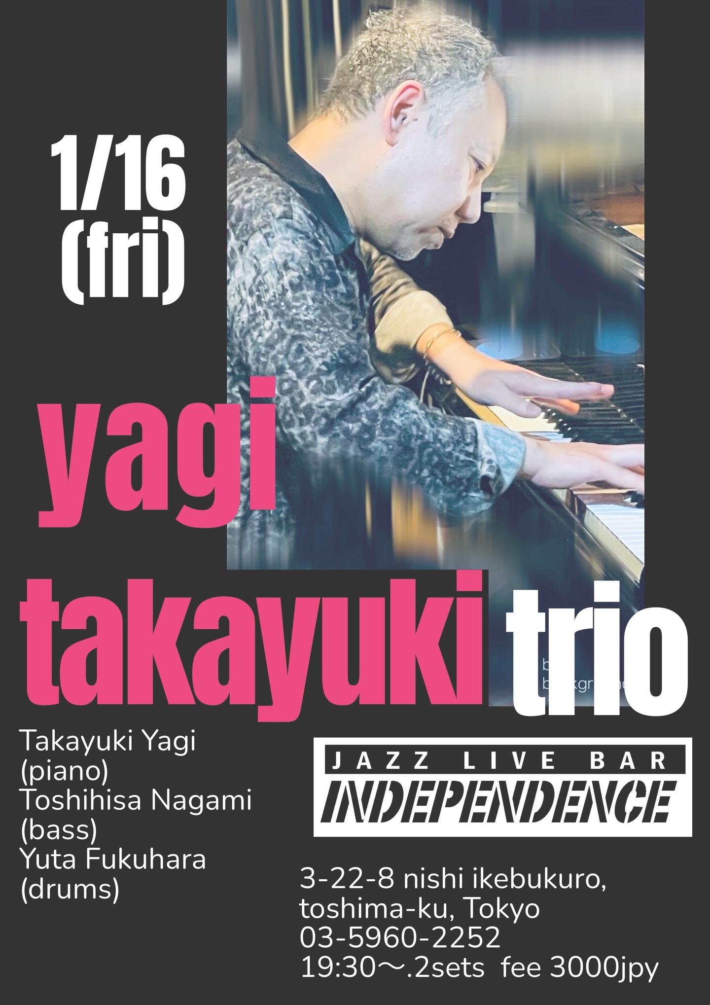 1/16(金)池袋インディペンデンス 八木隆幸(p)永見寿久(b)福原雄太(d)