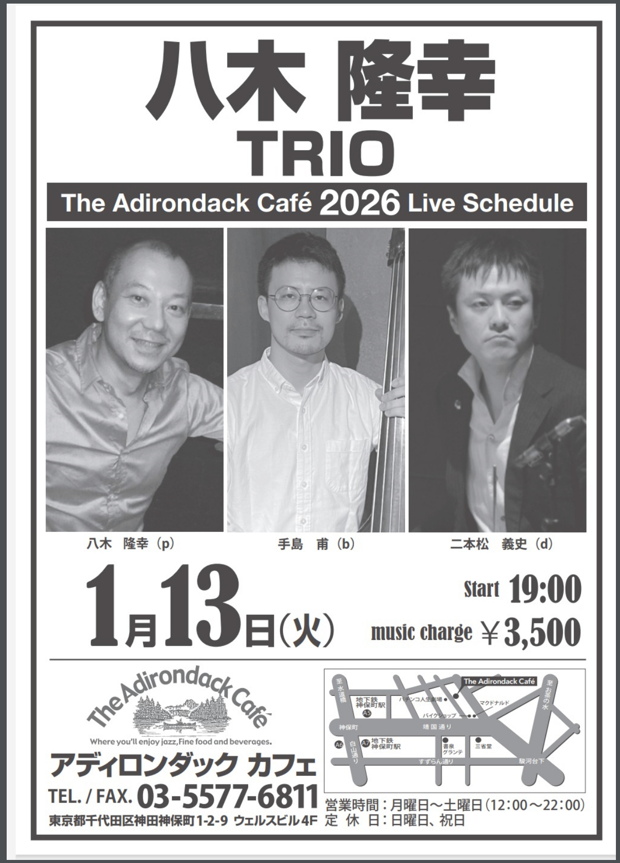 1/13(火)神保町アディロンダックカフェ 八木隆幸(p)手島甫(b)二本松義史(d)